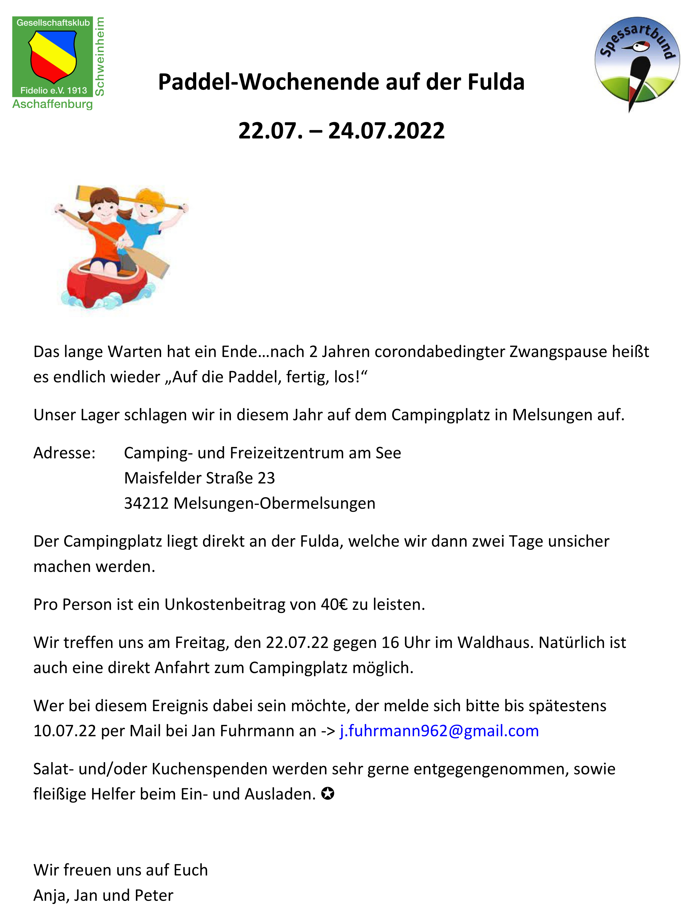 TREFFPUNKT: 22.07. um 16Uhr im Waldhaus / Alternativ direkte Anfahrt zum Campingplatz